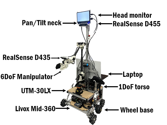 RealSense D455とヘッドディスプレイが搭載されています。 それらはDynamixelで構成されたPan/Tilt機構によって上下左右の自由度を持ちます。